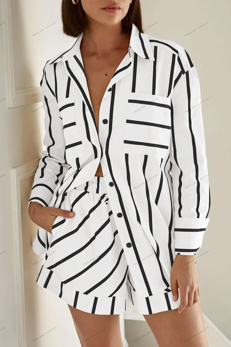 Stay cool and stylish with the Stripe Colorblock Print Shirt & Shorts Set. This matching set is the perfect balance of comfort and contemporary design. The button-down shirt features bold colorblock stripes, creating a statement look, while the relaxed shorts offer a comfortable fit with an elastic waistband. Whether you're heading to a weekend brunch, strolling through the city, or lounging on vacation, this set ensures you look effortlessly chic all day long.